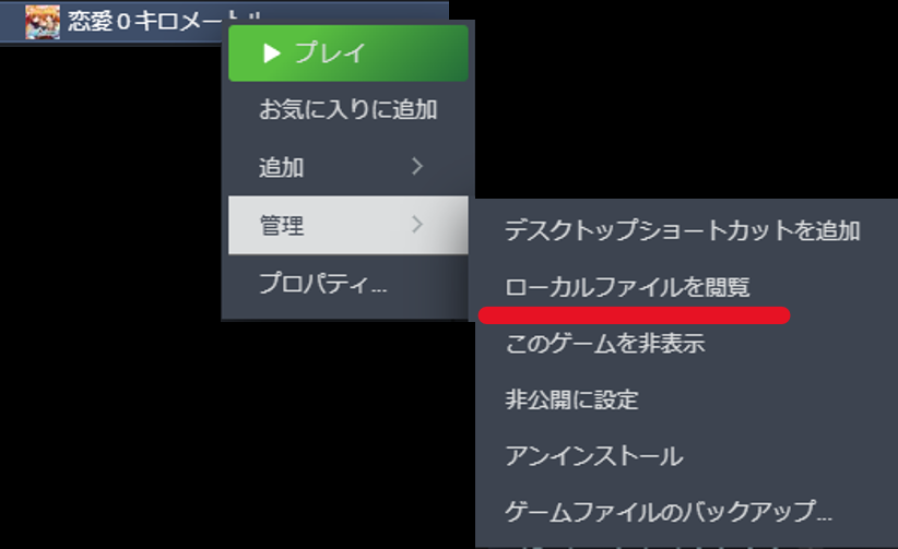 steamクライアントのライブラリから「恋愛0キロメートル」を右クリックしてください。