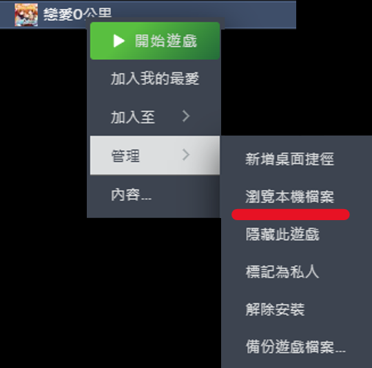 如果您找不到安裝 戀愛0公里 的資料夾,請在 steam 客戶端的資料庫中右擊 戀愛0公里。